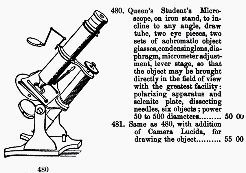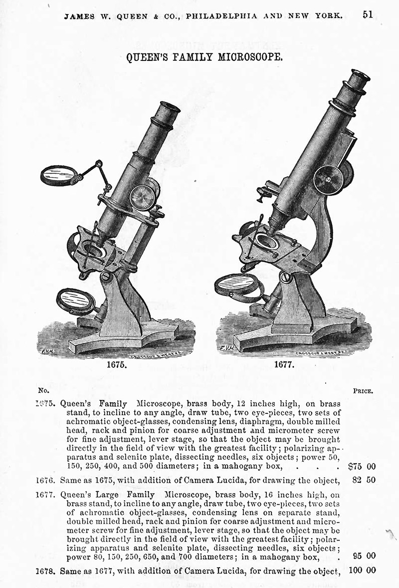 In addition to McAllister, a similar microscope with an iron stand was offered in the 1859 James W. Queen & Co.