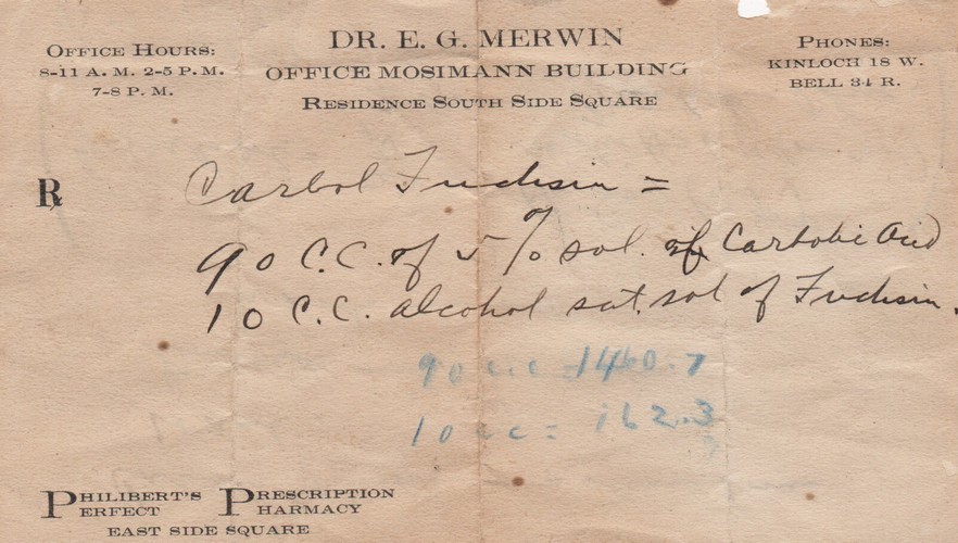 Dr. E. G. Merwin mentioning Philibert's Pharmacy,