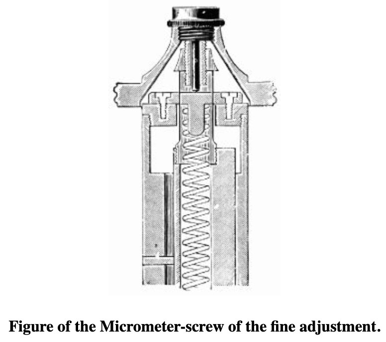 This in turn requires one complete revolution of the axle a, the drum of which is graduated into 100 parts. The value of each division on the drum is therefore 0,1/100=0,001 mm.