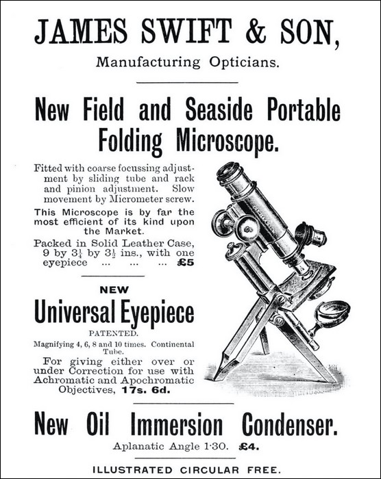 Swift originally called this model the New Field and Seaside Portable Folding Microscope and later the Portable Clinical and Field Microscope. It was described as follows: