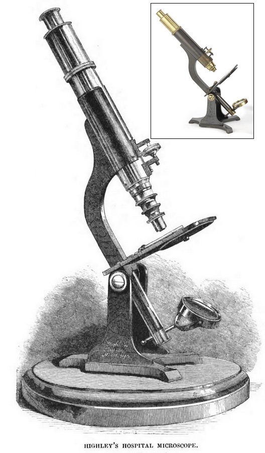 Highley, London. Note the similarities in the shape the limb, the slit in main tube for the nose-piece fine adjustment mechanism, and the blackened finish on the brass in comparing the microscope shown on this page with Highley’s Hospital Model microscope .