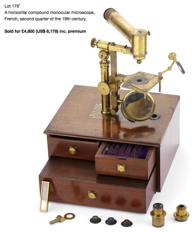 The stage measures 9 x 6.5 cm with a 40 mm center hole. Focusing is by rack and pinion movement of the stage using a single milled brass pinion knob. The rack is inset into the bar and held in place by two screws. The stage with two stage clips has an opening made with a counter-sink; a disk that holds the aperture wheel fits into this. With the examples made by Chevalier, the aperture wheel is mounted on a separate arm located under the stage. The stage can be easily detached from the main body and reinserted upside down for use when the microscope is in its inverted configuration. The main column of the microscope is topped with a compass joint that allows the instrument to be inclined when used in vertical mode. Above this joint is the limb that carries the prism holder and the tube. The bar that holds the mirror and stage is screwed into this limb with a blued steel screw. At the rear of the limb is a milled knob engaging a brass washer loosening this knob allows the limb to be freely rotated where it can then be tightened leaving the tube and stage at any desired angle. The nosepiece that holds the objective, prism, and tube can be removed from the body of the microscope via a bayonet joint that is activated by pressing a spring-loaded saddle-shaped knob on the limb. Removal of the nosepiece reveals a tapered shaft and two steel pins used to line up this part with the limb. This is one of the novel features that distinguish this microscope from those made by Chevalier where the nosepiece is secured to the limb with a brass-headed steel pin. Like the similar model made by Chevalier, but using a different mechanism, the front part of the limb can be rotated out of the plane of the stage to allow easier changing of the objectives. The tube incorporates a drawtube to extend its length. The photos show the microscope set up in horizontal, vertical, inverted (chemical), and simple microscope configurations.