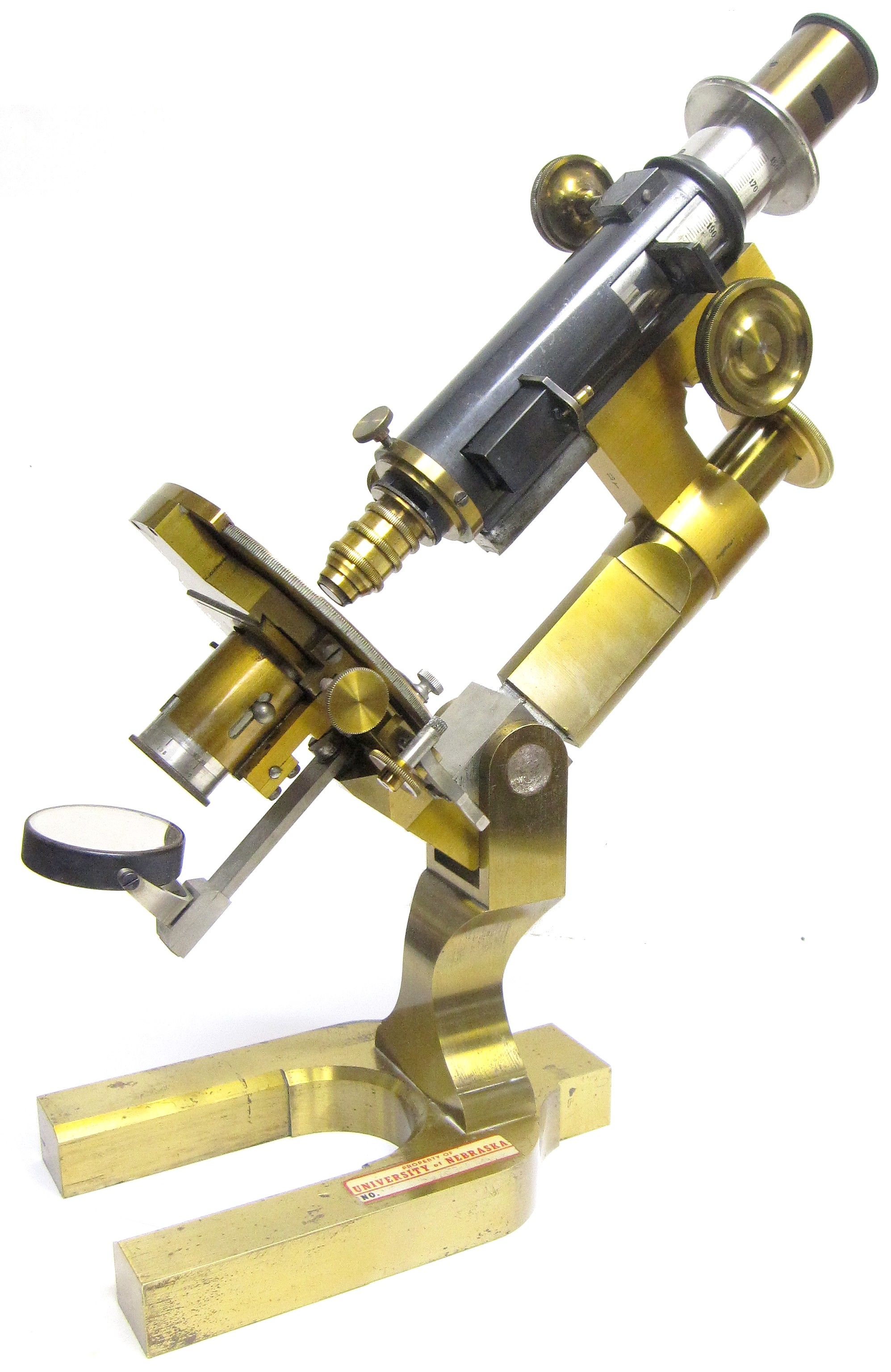 Attached to the base of the microscope is an inventory label from the University of Nebraska (founded in 1869). Evidently, this instrument was used during the earlier years of that institution.