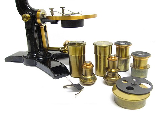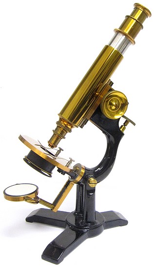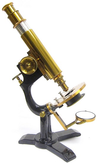 MODEL MICROSCOPE. This microscope was originally constructed in compliance with a generally expressed demand for a simple, low-price and well-made instrument, which is adapted to every grade of work, and claim that in it we have a model which possesses, in an eminent degree, these qualities. Probably no low-price instrument has ever been offered the public, which has been so favorably received and met with such ready sale as this. It is of chaste design, its parts arc all calculated to bear the strain of every-day work, and on this account and because of its simplicity, it may be used by inexperienced hands, without detriment or injury to it. This microscope especially recommends itself by requiring a smaller pecuniary outlay than any of similar construction, and may be supplied with valuable additions, such as our revolving and glass stages, mirror-bar with adjustable mirror and sub-stage, all of which greatly increase the efficiency and add but little to the price of the instrument. The tripod base, pillars and arm, are neatly japanned; the axis is arranged with strong bearings to allow inclination of the body to any angle. Coarse adjustment is by perfect rack and pinion, provided with tightening screws; fine adjustment by a delicate micrometer screw, acting on our patent movement. As at present constructed, the arm is considerably lengthened to allow the more convenient use of low-power objectives, as well as the double, triple and quadruple nosepieces. The stage is of brass, circular in form, thin to allow great obliquity, but of sufficient strength to be firm under manipulation. Attached to its lower side is a sub-stage ring and revolving diaphragm, both of which maybe removed. The main tube is arranged with cloth lining, in which the draw-tube is fitted; it is provided with the society screw to receive low-power objectives, amplifier or analyzer of polariscope. Plane and concave mirrors are of large size, adjustable on the mirror-bar, which is a feature possessed by few low-price instruments, although it is of considerable importance, from the fact that a change in the distance of the light requires a corresponding adjustment of the mirrors; the mirror-bar swings on a large bearing (the axis of which lies in the plane of the stage) to any obliquity below and above the stage, the latter for the illumination of opaque objects. |