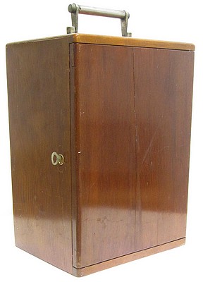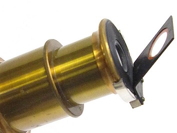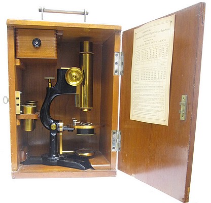 The microscope is signed on the stage: Bausch & Lomb Optical Co. Stamped on the inside bottom the case is the serial number 7741 corresponding to a date of manufacture of 1890. On the upper part of the limb are the two patent dates shown above (click to download the patents). It is an example of the B&L "Model" microscope. The microscope is constructed in bright lacquered brass and black japanned iron. It stands about 13-inches in height in the inclined position as shown in some of the photos with the nickel plated drawtube partially extended. The drawtube has a Society Screw on the lower end to accommodate very low power objectives and other accessories. The coarse focusing is by rack and pinion and the fine focus utilizes a micrometer screw, which operates the patented B&L mechanism. The round lacquered brass stage has the two stage clips. The substage consists of a wheel of diaphragms. The mirror is adjustable on its swinging arm and is double sided with plane and concave glasses in good condition; it can be positioned above the stage to illuminate opaque objects. The microscope is supplied with two B&L eyepieces (marked B and D) and two B&L objectives (marked 1/5 and 3/4) with their brass canisters. Also found with the microscope is the B&L camera ludica, which can be attached to either eyepiece. The microscope is in very good mechanical condition. All adjustments are in working condition. The optics are also in fine condition. The lacquered brass surface finish is original and is in pristine condition as is the japanned iron base and limb. The wood storage box with nickel plated brass handle, internal draw (containing some blank slides and cover slips), magnification chart, lock, and key is in nice condition with a good surface finish; there is a crack on the front door due to wood shrinkage, but it is nevertheless in solid condition.